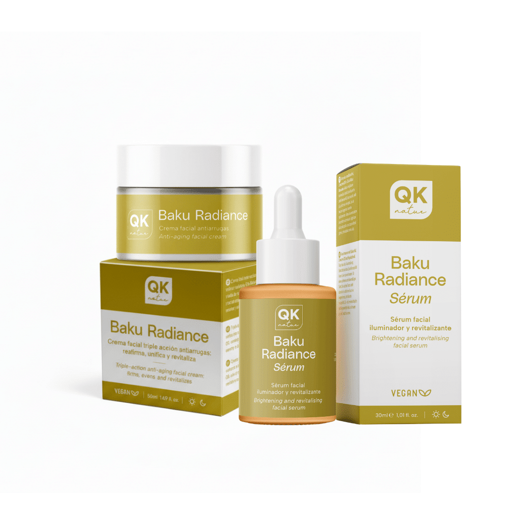 El Pack Baku Radiance de QKnatur está diseñado para ofrecer una rutina facial completa enfocada en la luminosidad, la hidratación y el cuidado antiedad. Este pack combina el Sérum Baku Radiance y la Crema Facial Baku Radiance, dos productos que trabajan en conjunto para mejorar el aspecto de la piel y aportar nutrición diaria.